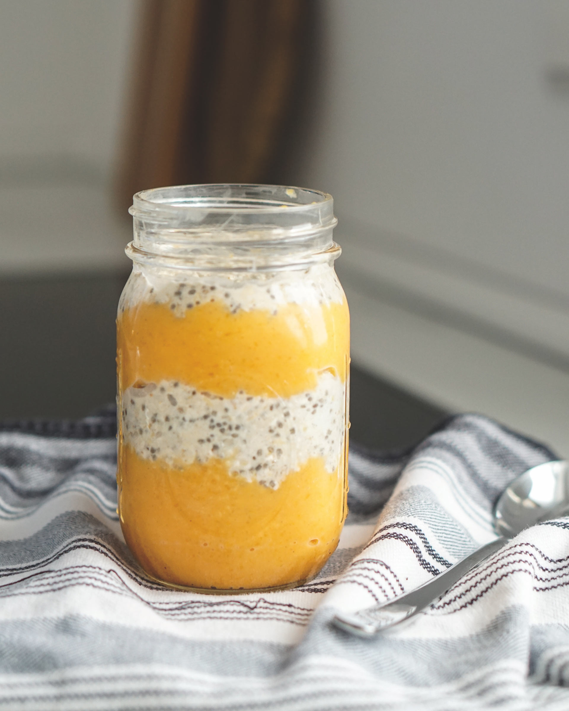 Use a second bowl to mix 100 ml almond drink, oats, chia seeds and vanilla. Place in the fridge overnight. In the morning, remove from the fridge and layer both fillings by turns in a glass jar.
